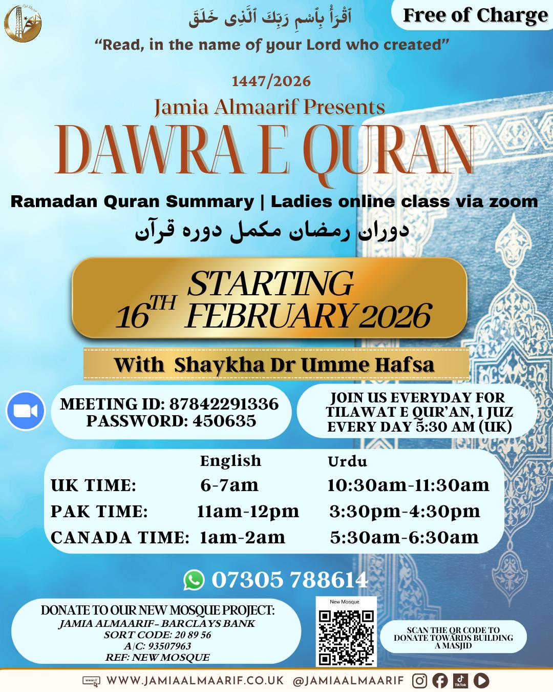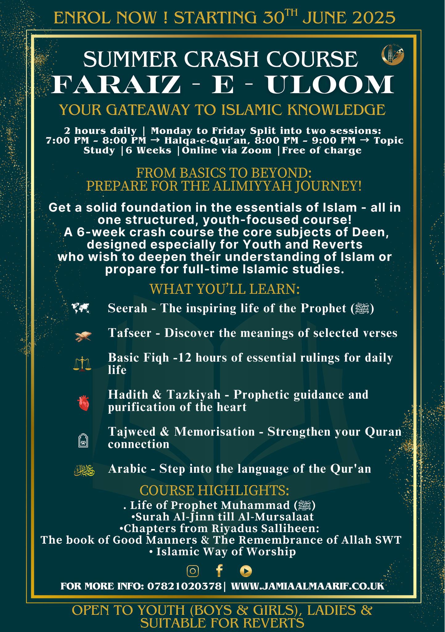 A 6-week structured course covering all core Islamic subjects: 📖 Seerah, Tafseer, Fiqh, Hadith, Tazkiyah, Tajweed, Memorisation & Arabic 🕒 Mon–Fri | 7–9 PM (Halqa-e-Qur’an...